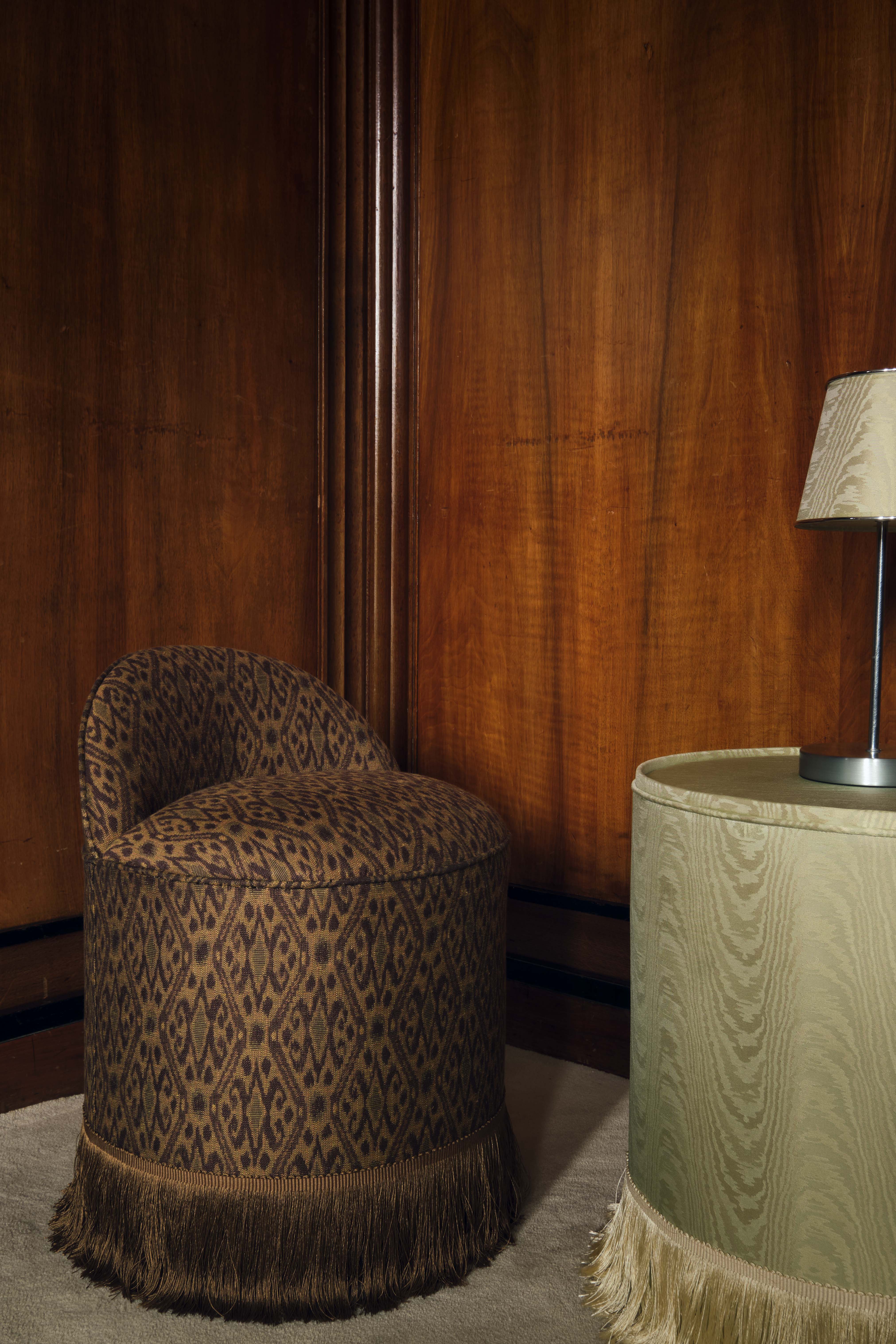 The Inferi stool, with the bar or salon in mind, provides a comfortable place to while away an evening. The curvilinear back rest is designed to lean comfortably into the lumbar curve. Inferi in Woven Ikat is self piped and finished with an optional fringe for a tonal indulgent look.