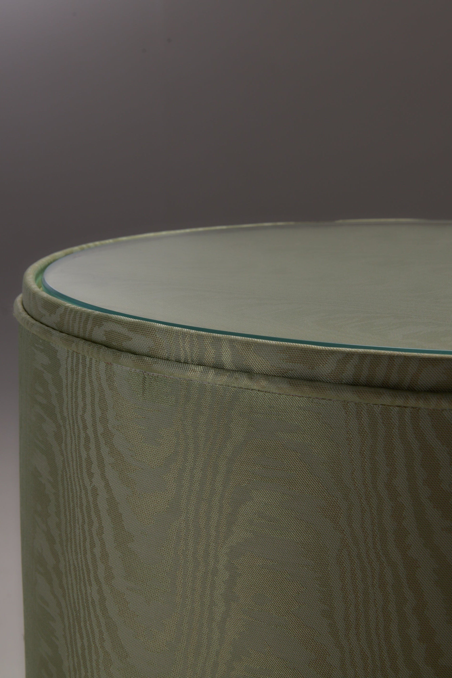 Pele is a whimsical upholstered alternative to the traditional occasional table, an enviable foundation for trinkets and personal effects. Finished in our silk Moiré Tissé