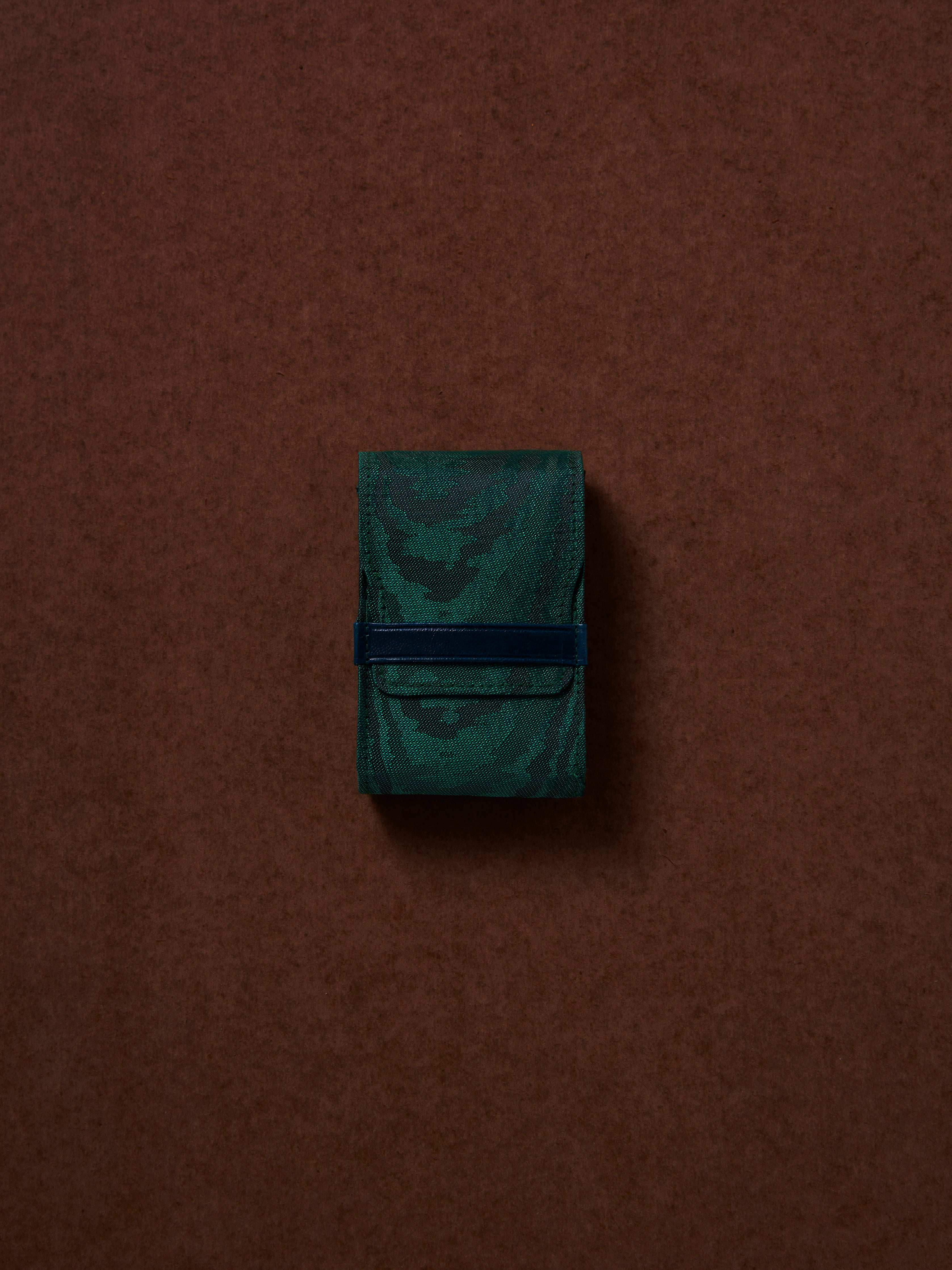 A single deck card sleeve bound in CC's moirè tissè - banker's lamp green, a silk moiré of rare beauty, woven with the finest yarns in one of England's oldest silk mills. Including a set of CC designed playing cards.