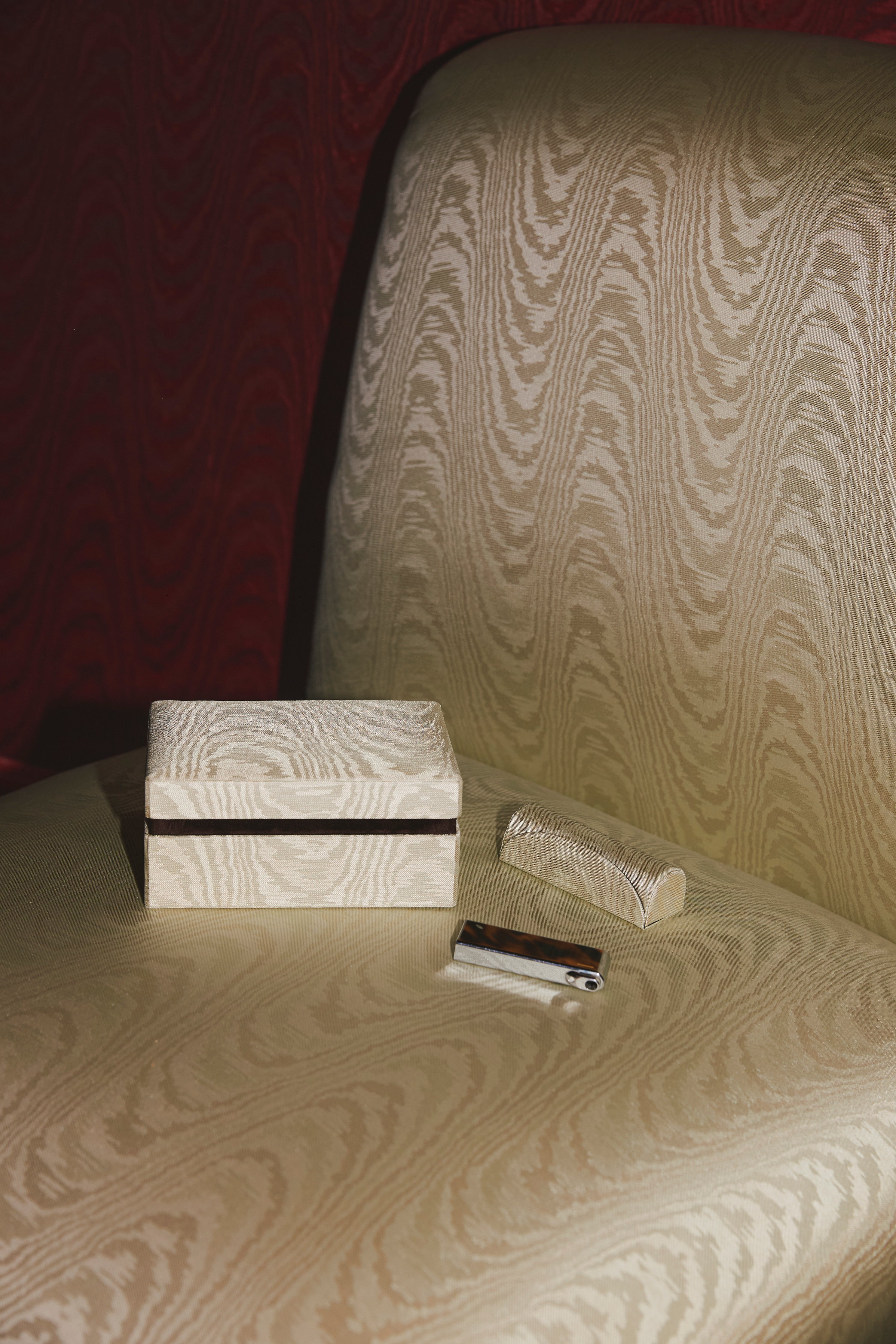 The Bound in CC's Moiré Tissè, a silk woven moiré of rare beauty, each jewellery case is lined in rich contrasting velvet and ensigned with the CC logo and presented in its own gift-able box.