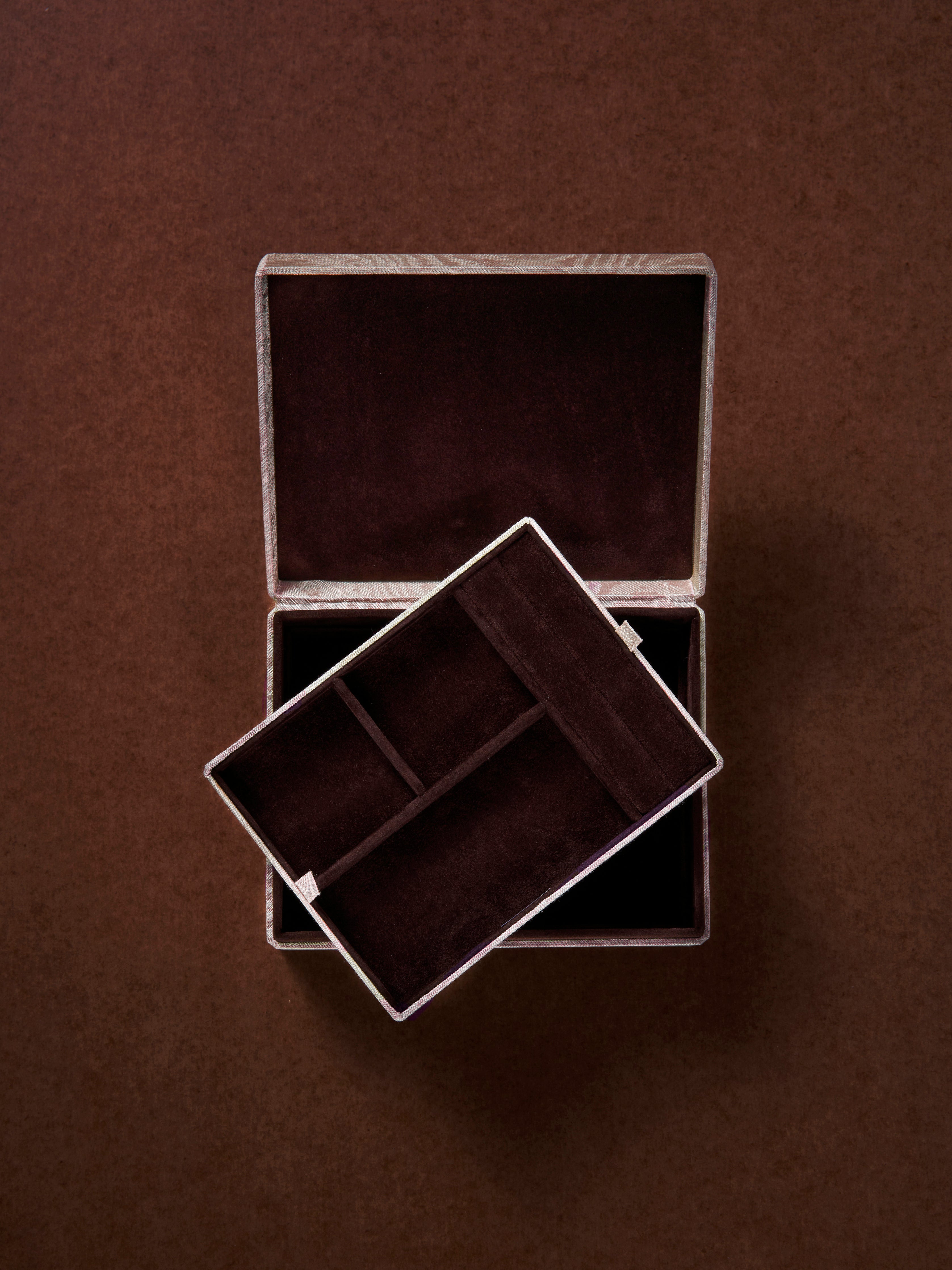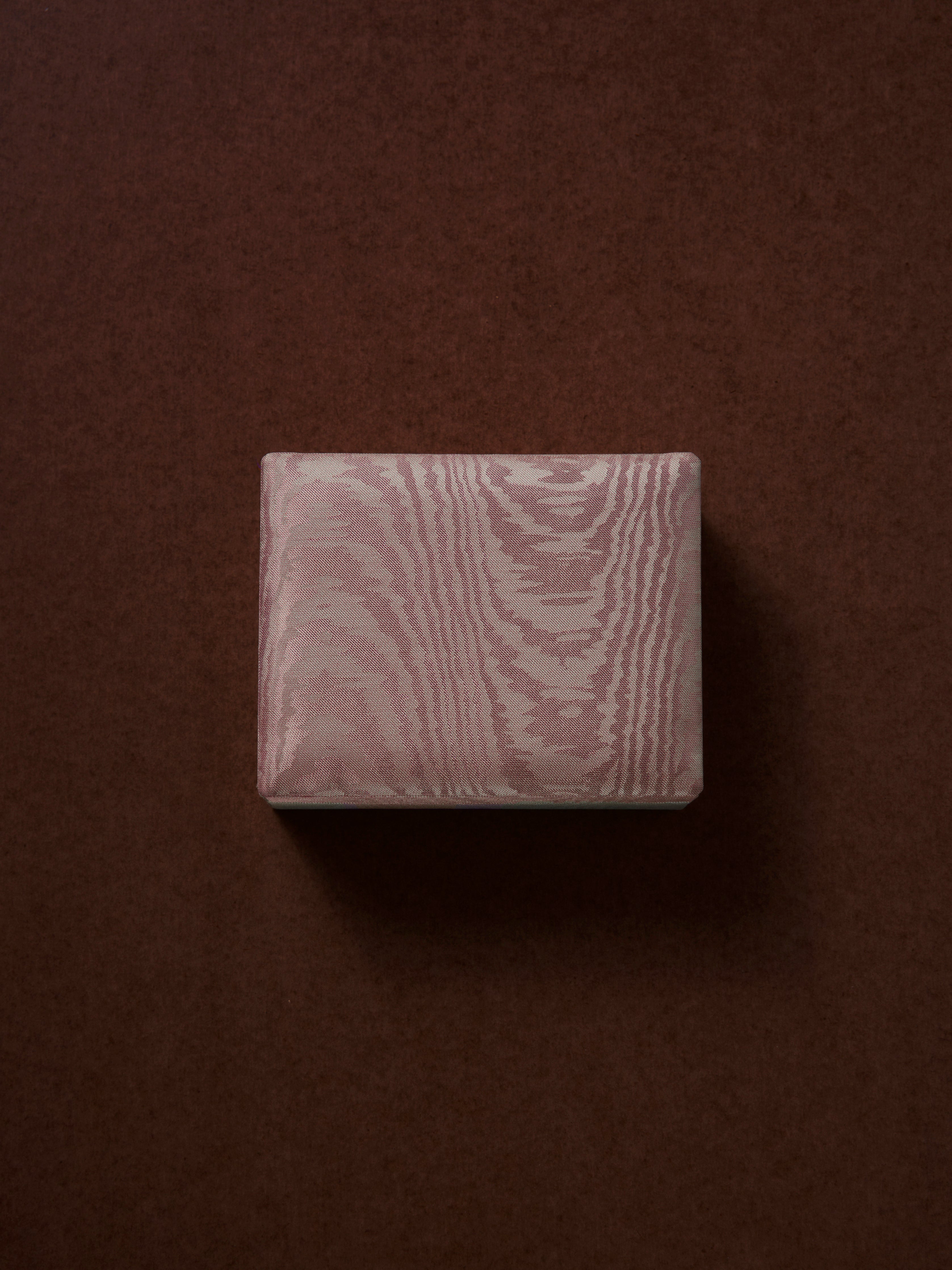 The Bound in CC's Moiré Tissè, a silk woven moiré of rare beauty, each jewellery case is lined in rich contrasting velvet and ensigned with the CC logo and presented in its own gift-able box.
